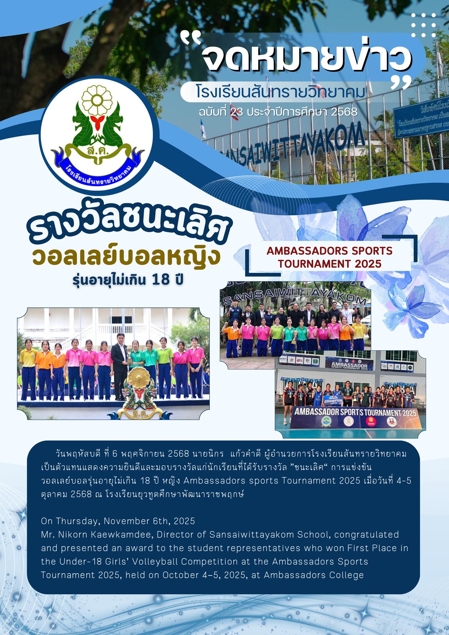 - ประกาศ ผลการสอบคัดเลือกนักเรียนเข้าศึกษาต่อโรงเรียนสันทรายวิทยาคม ชั้นมัธยมศึกษาปีที่ 1 และ 4 ปีการศึกษา 2568