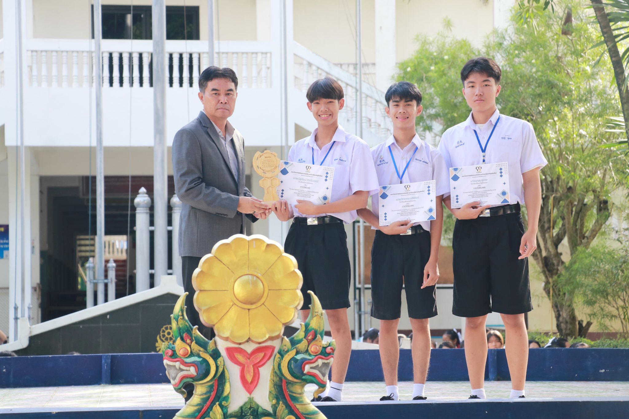 On Wednesday, September 3rd, 2025 Mr. Nikorn Kaewkamdee, Director of Sansaiwittayakom School, congratulated and presented awards to students who received an Honorable Mention in the “Dry Tray Garden Competition” on the theme “Science and Art You Can Do” for their work titled “Saran Nakin”. The competition was held on August 20th, 2025 at the Department of Industrial Arts, Faculty of Education, Chiang Mai Rajabhat University, as part of Science Week 2025 at the Sansai Dome. The students were trained and supported by their teacher, Mr. Sirapop Sunanta.