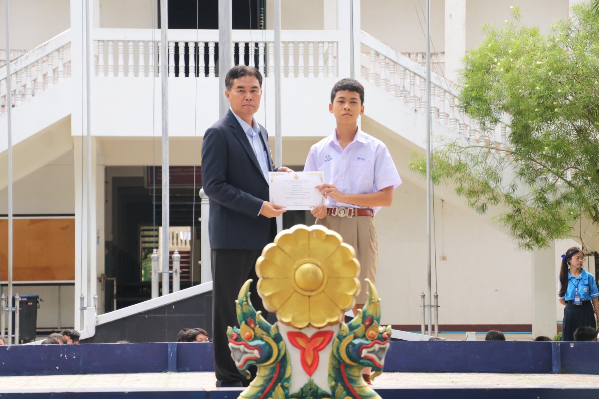 On Thursday, September 11th, 2025 Mr. Nikorn Kaewkhamdee, Director of Sansaiwittayakom School, congratulated and presented an award to Master Jueanghan on the occasion of winning 4th Place at the Chiang Mai Secondary Educational Service Area in the Thai Language Skills Competition on “Reading for Main Ideas in the PISA Style” for the lower secondary level.