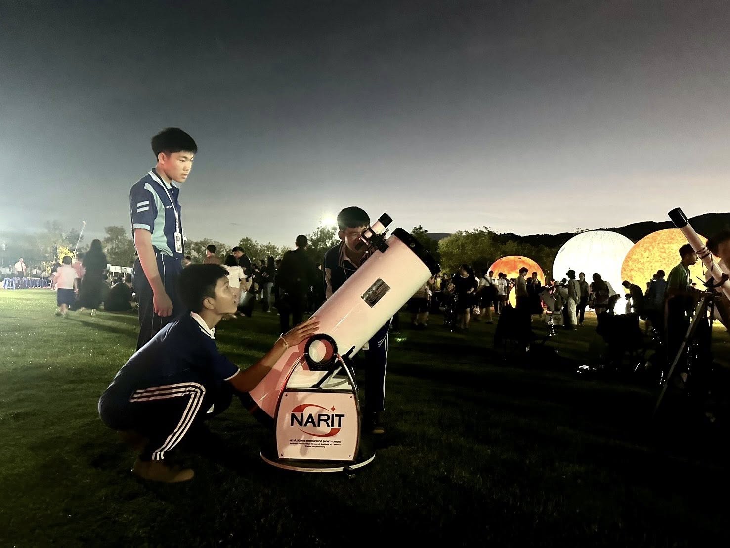 During the event, students provided telescope services for attendees to observe celestial objects, under the supervision of teachers Wasana Saengsawang and Suphannika Lumyai.