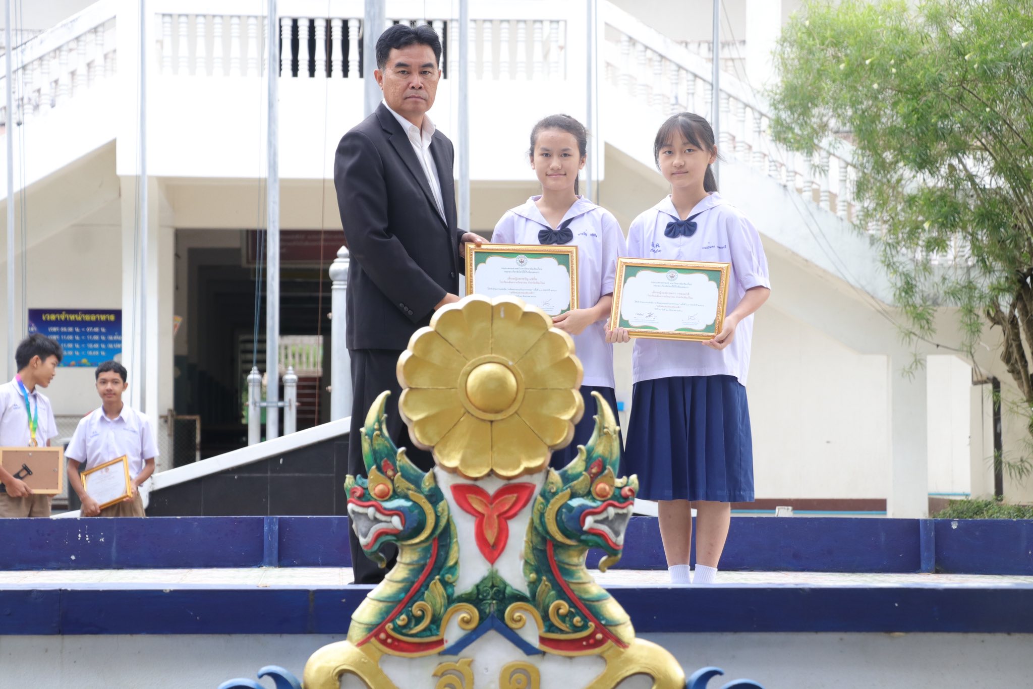 วันที่ 20 พฤศจิกายน 2568 นายนิกร แก้วคำดี ผู้อำนวยการโรงเรียนสันทรายวิทยาคม เป็นตัวแทนแสดงความยินดีและมอบเกียรติบัตรแก่นักเรียนที่ได้เข้าร่วมกิจกรรมการแข่งขันการแต่งคำประพันธ์ ประเภทกลอนแปด ระดับชั้นมัธยมตอนต้น ระดับประเทศ ได้แก่ เด็กหญิงพาขวัญ แซ่กือ ชั้นมัธยมศึกษาปีที่ 2/1 และ เด็กหญิงแพรวผกา กรองมาดี ชั้นมัธยมศึกษาปีที่ 1/2 ฝึกซ้อมโดยนางสาวประภาพร กมลสมัย ครูผู้สอนวิชาภาษาไทย จัดโดย คณะแพทยศาสตร์มหาวิทยาลัยเชียงใหม่ On 20 November 2025, Mr. Nikorn Kaewkamdee, Director of Sansaiwittayakom School, represented the school in congratulating and presenting certificates to students who participated in the national-level poetic composition competition (Klon Paet) for lower secondary students. The participating students were: • Miss Phakhwan Saekue, Grade 8/1 • Miss Phraewphaka Krongmadee, Grade 7/2 The students were trained by • Ms. Praphaporn Kamonsamai, Thai language teacher. The competition was organized by the Faculty of Medicine, Chiang Mai University.