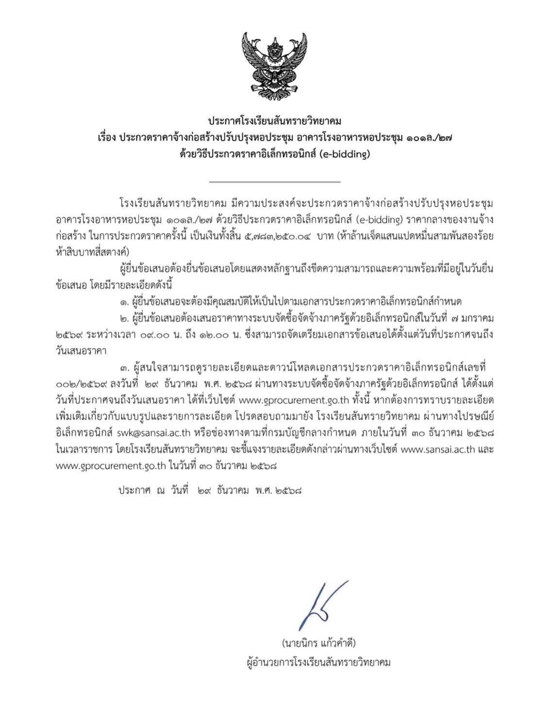 ประกาศโรงเรียนสันทรายวิทยาคม เรื่อง ประกวดราคาจ้างก่อสร้างปรับปรุงหอประชุม อาคารโรงอาหารหอประชุม ๑๐๑ล./๒๗ ด้วยวิธีประกวดราคาอิเล็กทรอนิกส์ (e-bidding)